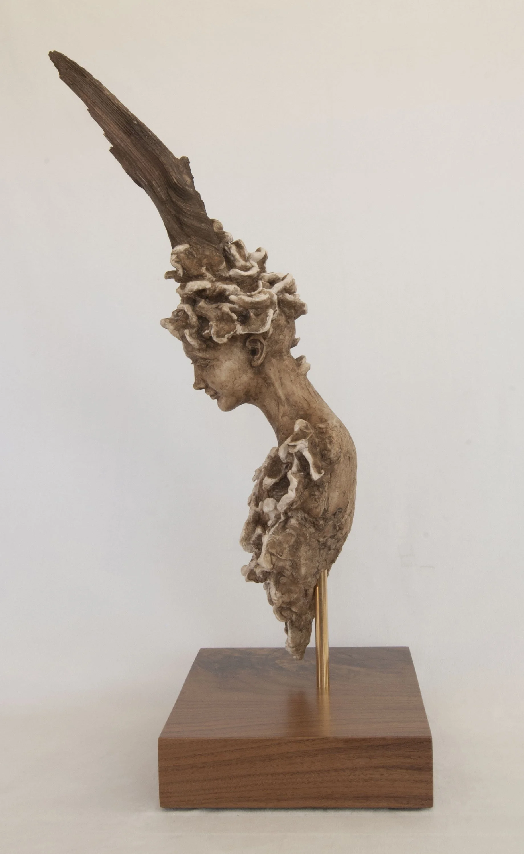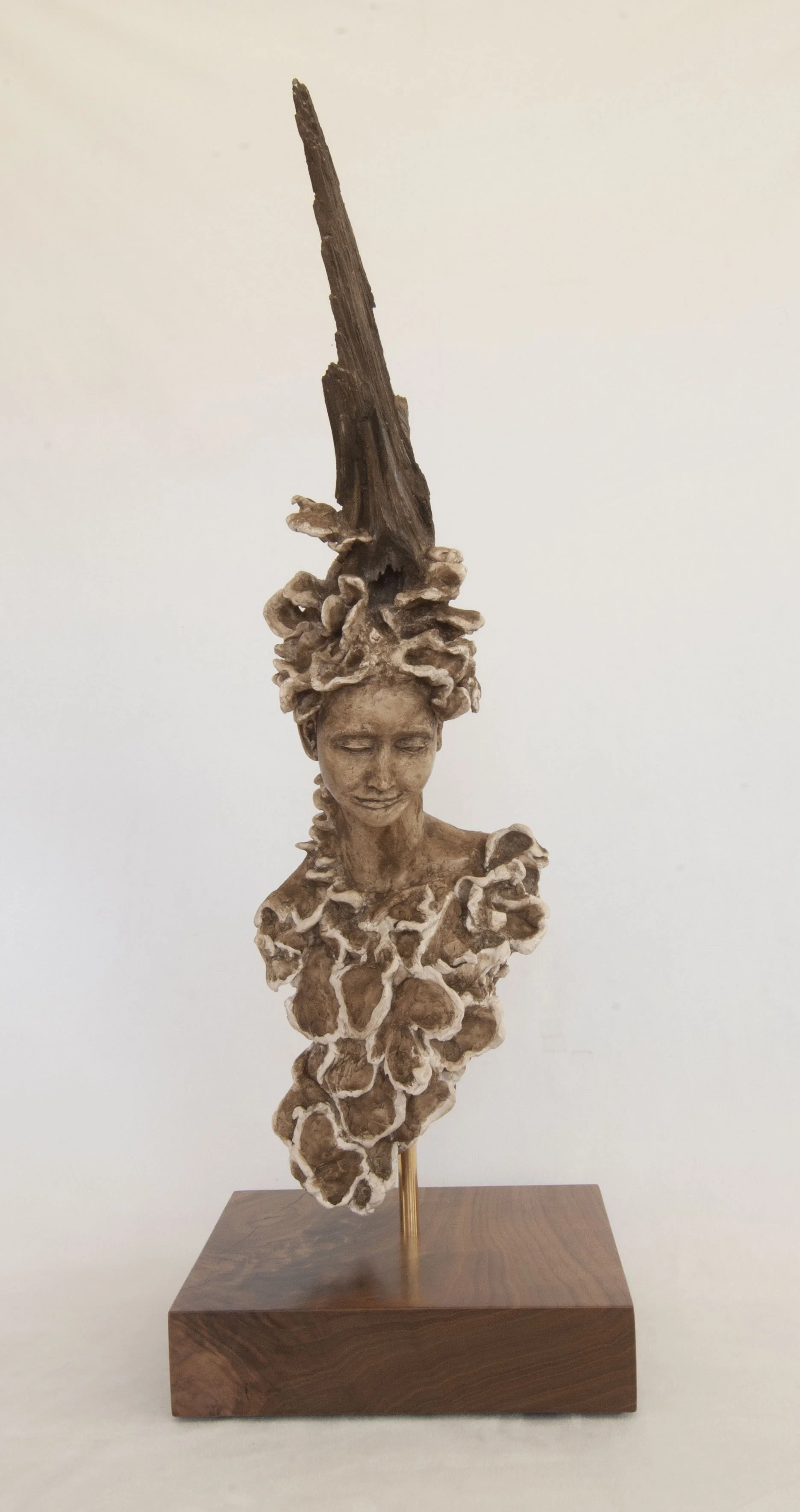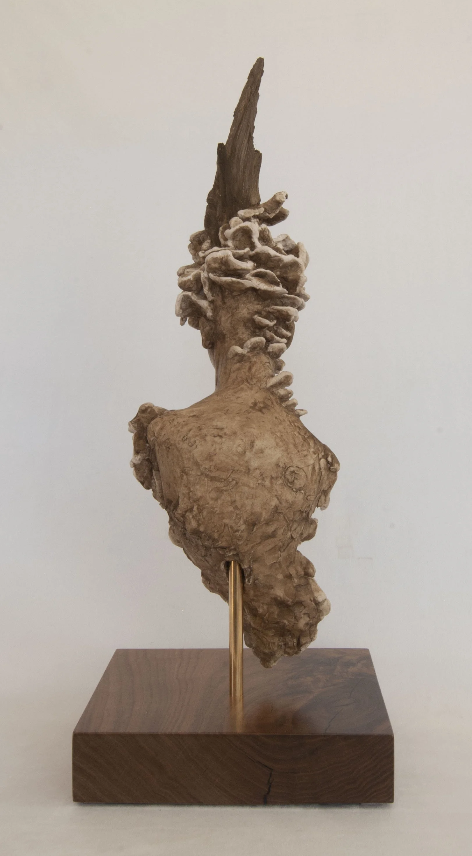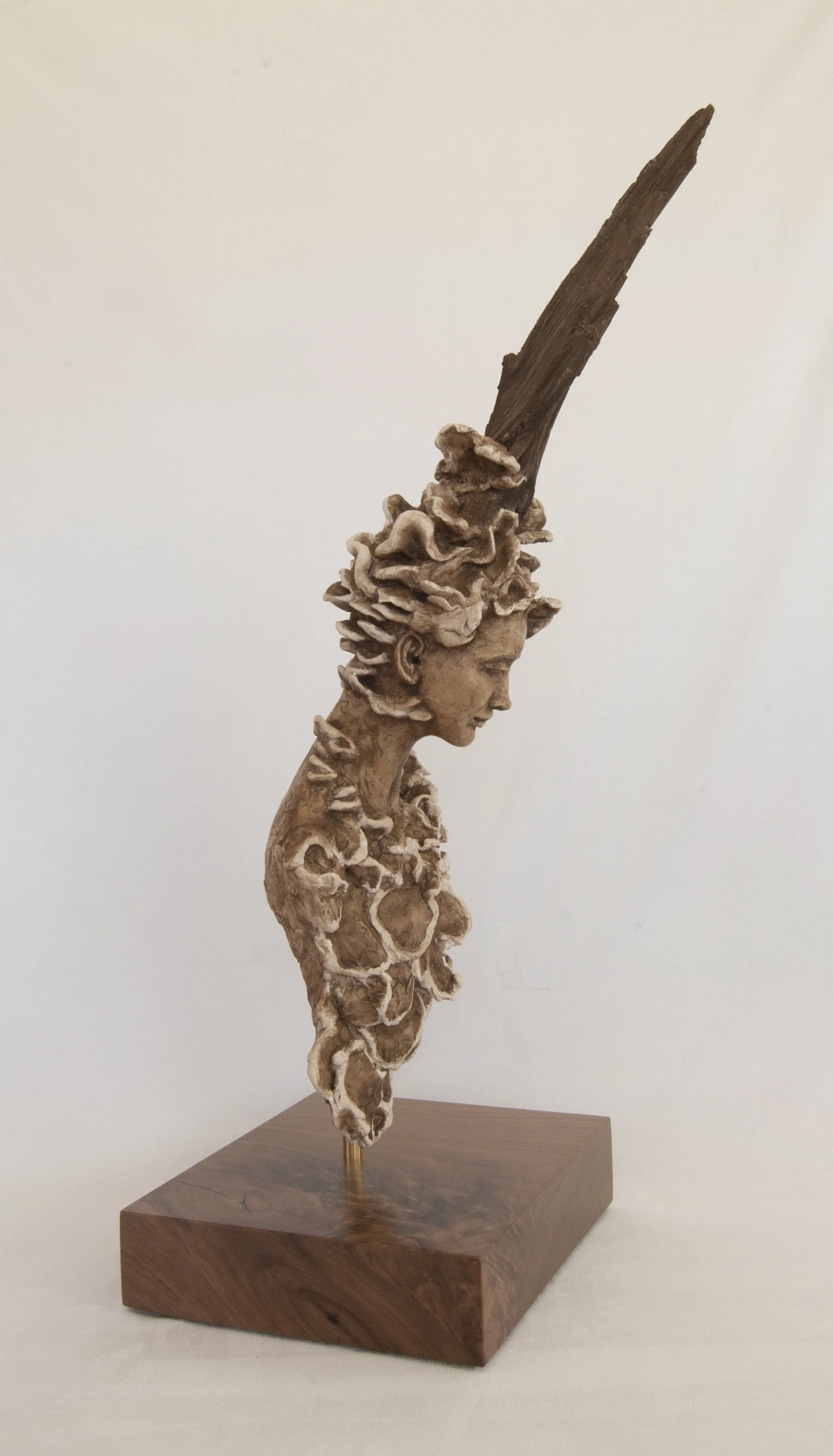 Materials: AquaResin (A water based, non-toxic, sculpting resin. In compliance with LHAMA –toxicologist certified and ASTM D-4236. Demonstrably green-sustainable. VOC-free.) Tinted with Casein paint, an aqueous medium using a milk-based binding agent - an ancient and one of the most durable mediums known to man. Acrylic fixative is applied to the sculpture for extra protection. The sculpture is mounted with a brass rod and sits atop a gorgeous piece of walnut, sourced from a family farm in North Carolina. We also do all the finishing work (cutting, sanding, coating, etc.) on the sculpture base.