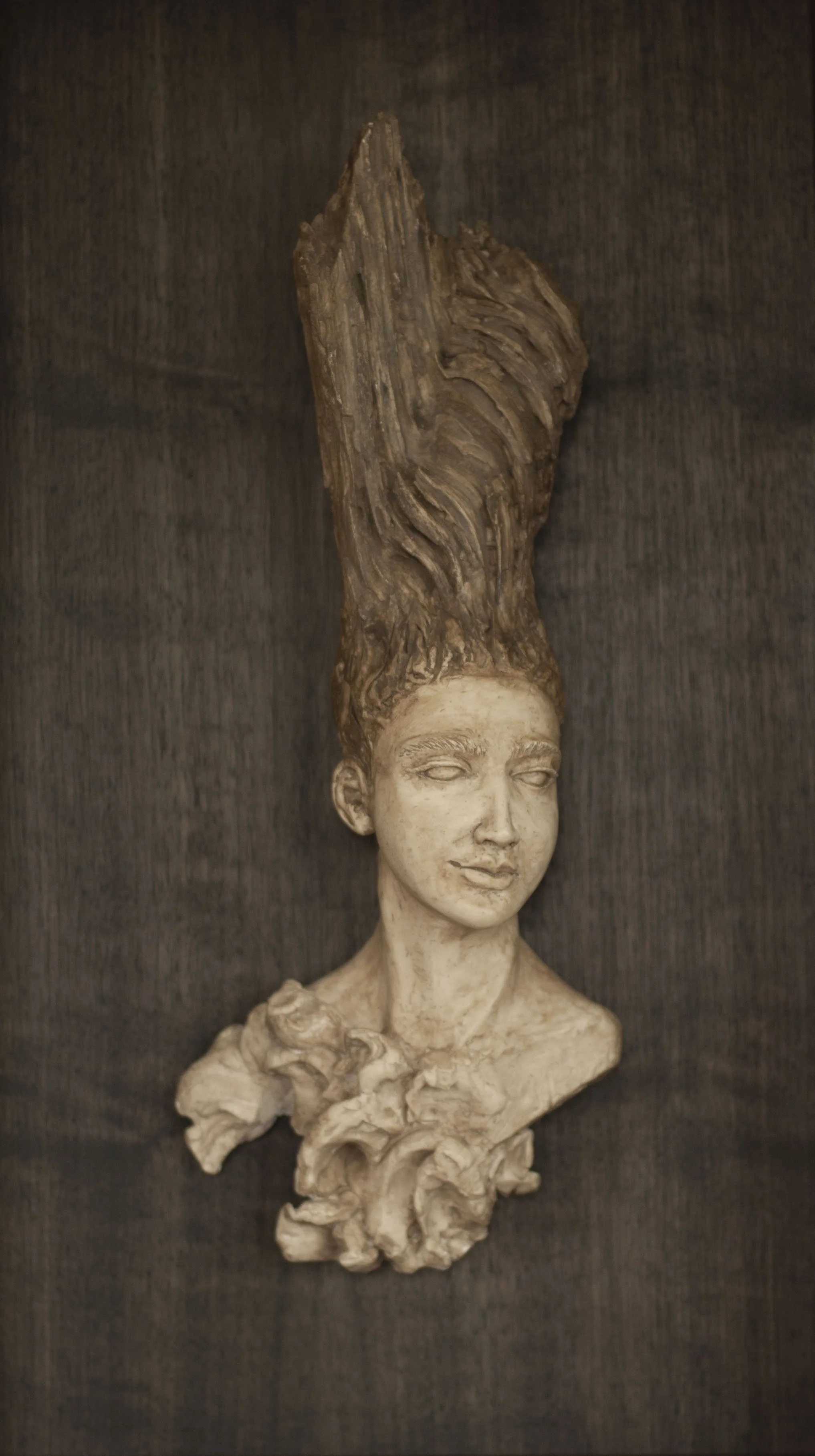 Materials: AquaResin (A water based, non-toxic, sculpting resin. In compliance with LHAMA –toxicologist certified and ASTM D-4236. Demonstrably green-sustainable. VOC-free.) Tinted with Casein paint, an aqueous medium using a milk-based binding agent - an ancient and one of the most durable mediums known to man. Acrylic fixative is applied to the sculpture for extra protection. The sculpture is mounted within a beautiful, locally crafted walnut frame. Hanging hardware included - professional installation recommended.